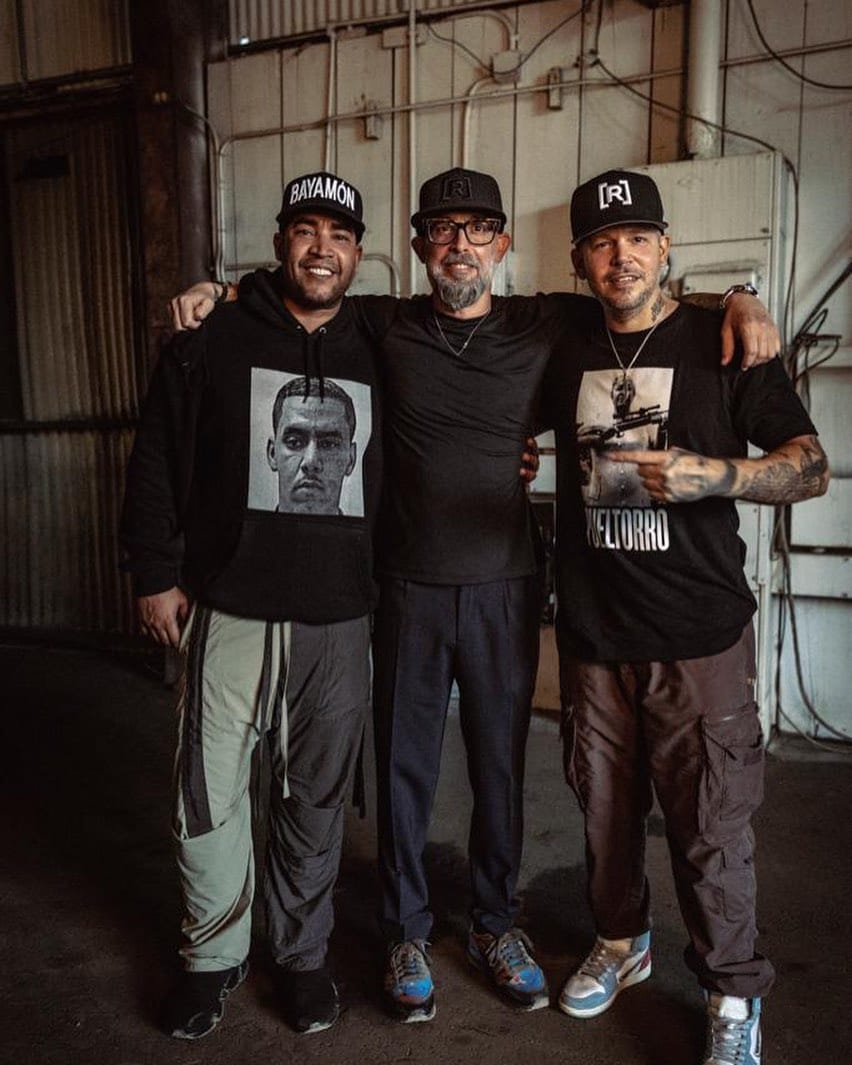 Kacho López Mari with many of the artists he's worked with including Chayanne, Don Omar, Residente, Juanes, Tego Calderón, Daddy Yankee and the music producer Echo, and Bad Bunny. | Photo via Kacho López Mari's Instagram | Impulsiva Stories